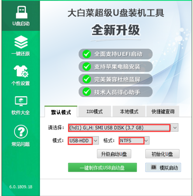2、在默認模式下進行選擇,一鍵制作啟動盤;