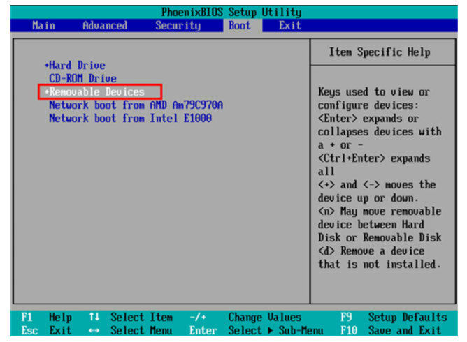 3、查看說明,按+鍵實現向上移動,我們需要將“removable device”移到最上面,這樣才能實現從U盤啟動,如圖所示: