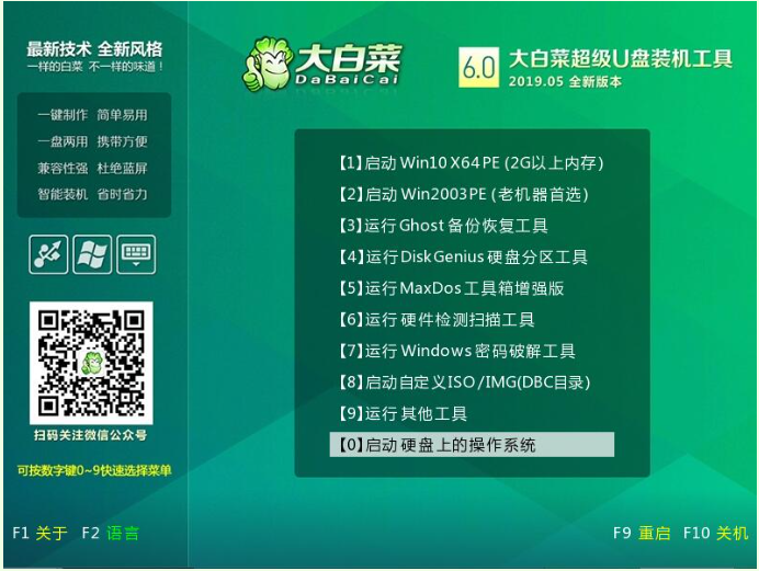 3、進入大白菜主菜單后,通過“↑↓”鍵選擇“【1】啟動Win10 X64PE(2G以上內存)”后回車確認,進入pe系統。