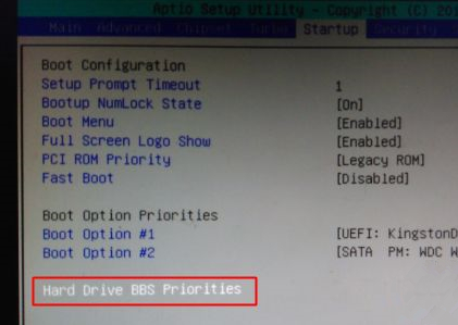 5、如果是以下界面,按→方向鍵切換到Boot或Startup,選擇Hard Drive BBS Priorities回車;