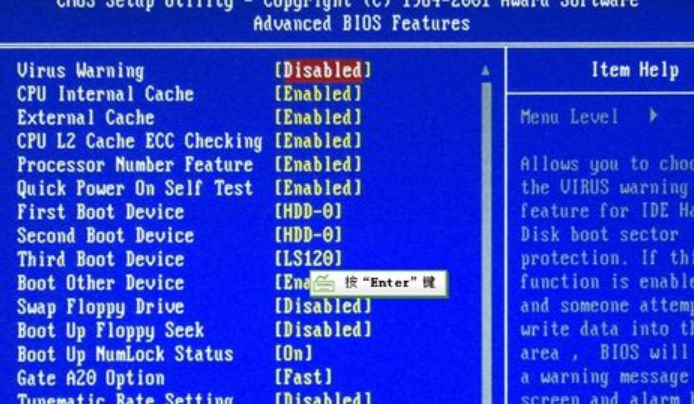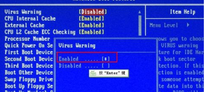 操作方法:以Virus Warning:病毒報警選項設置為例。選擇好后,回車