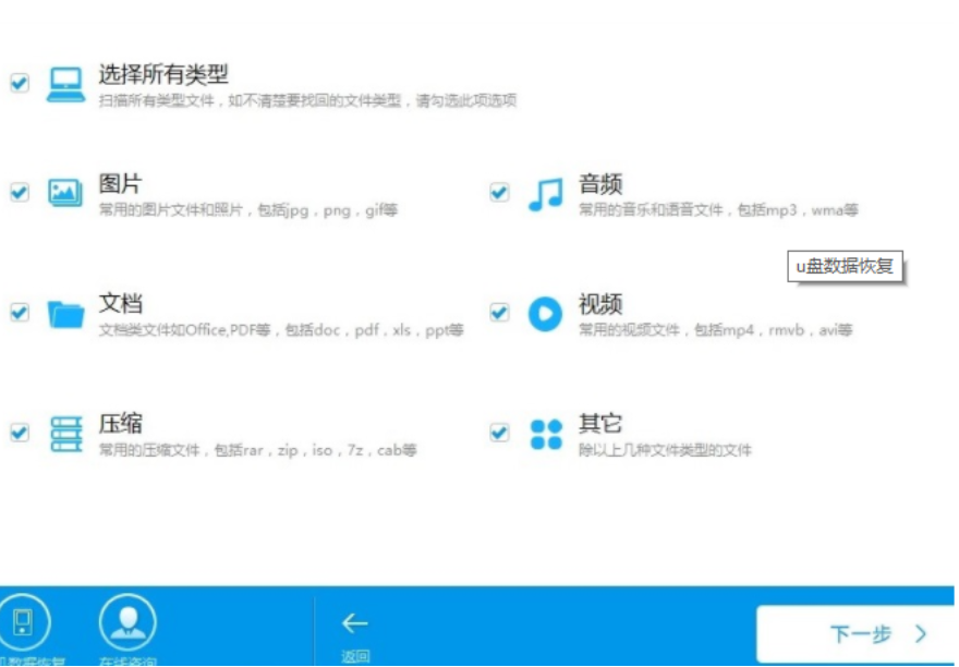 總結:打開下載好的U盤數據恢復大師,u盤插入電腦,選擇“U盤/存儲卡”。選擇u盤,選擇需要恢復的數據類型,軟件會自動掃描,之后會出現需要恢復的文件列表,選擇需要恢復的文件,點擊恢復就好啦。