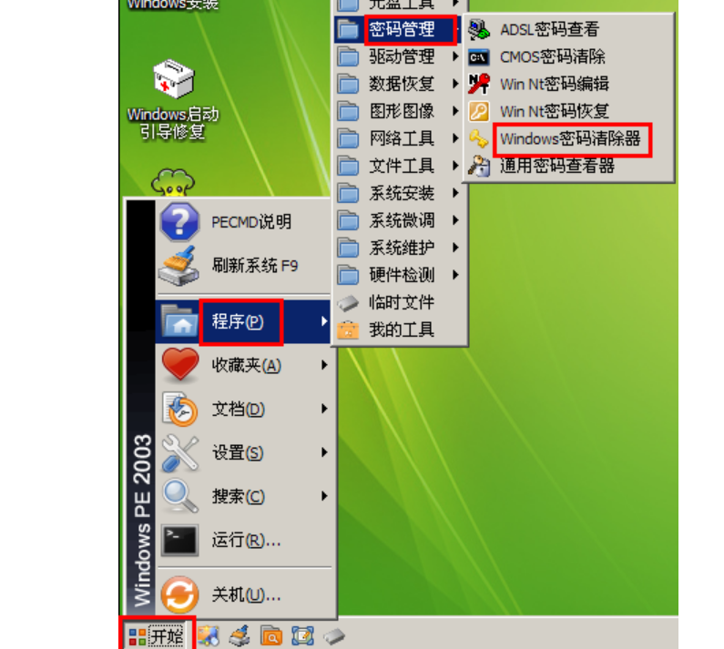 2、單擊左下角的開始菜單,依次進入“程序” — “密碼管理” — 選擇“windows密碼清除器”