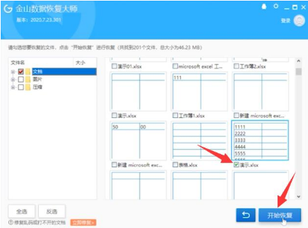 2. 掃描完成后選擇恢復的數據類型,勾選需要恢復的文件,選擇開始恢復。