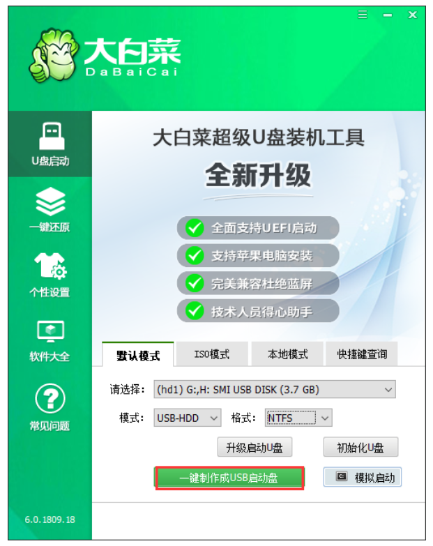 1、下載并安裝好大白菜裝機版,打開軟件并插入U盤,選擇默認模式,點擊需要制作啟動的設備,在模式選項中選擇USB-HDD,格式選擇NTFS