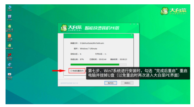 17、Win7系統進行安裝時,勾選完成后重啟重啟電腦并拔掉U盤(以免重啟時再次進入大白菜PE界面)