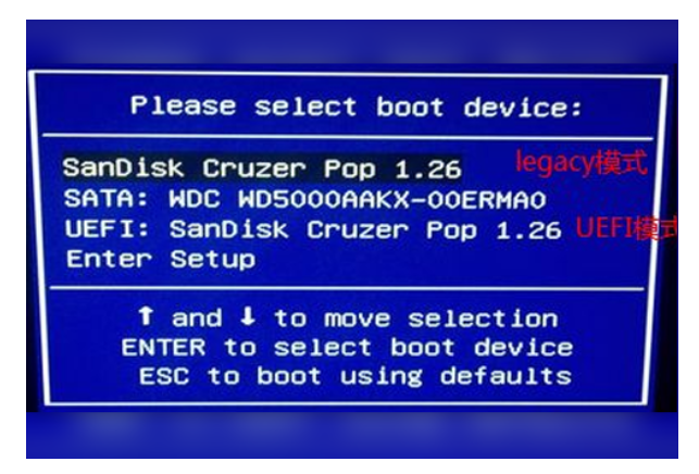 9、查詢該電腦機型的U盤啟動快捷鍵,重啟出現開機畫面后按下此鍵,進入優先啟動項設置界面,通過鍵選擇U盤選項后回車進入大白菜winpe界面,如下圖所示,選擇帶有USB字樣的或者選擇自己的U盤名稱標識(這里我u盤名稱就是Sandisk Cruzer pcp1.26)