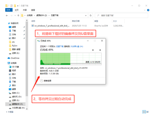 8、下載完成后,找到下載好的WIN7 ISO/GHO鏡像拷貝到U盤目錄,由于ISO/GHO文件通常都比較大,可能需要等待5~10分鐘