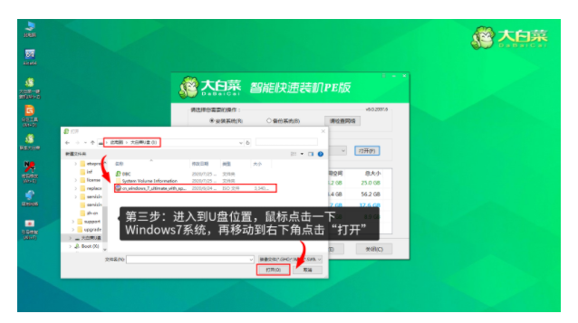 13、進入到U盤位置,鼠標點擊一下windows7系統,再移動到右下角點擊打開