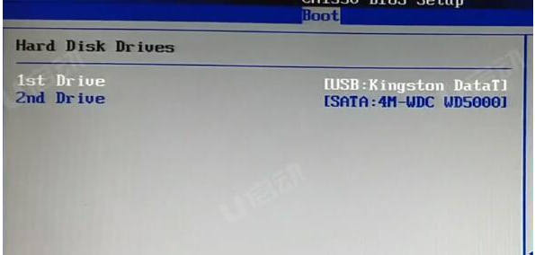 3、返回到BIOS主界面,進入【Boot】菜單,將【Hard Disk drives】中的【1st Device】修改為【USB:XXXX(U盤名稱)】。