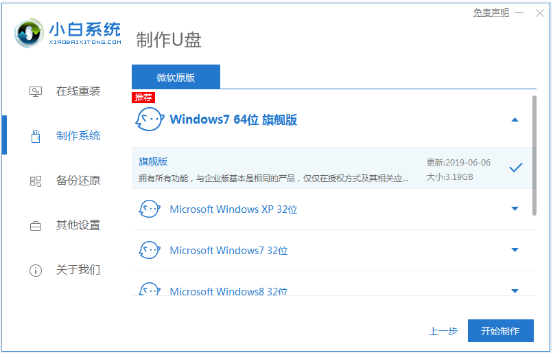2、選擇需要制作啟動盤的系統,點擊開始。