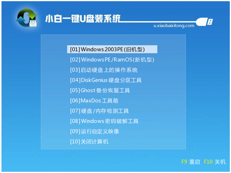 8、在開機時按下U盤啟動快捷鍵(一般為 F12、Esc、Del、F2)并設置USB為第一啟動, 進人到【小白U盤制作維護工具】,選擇【02】Windows PE/ramos(新機型)進入小白PE系統。
