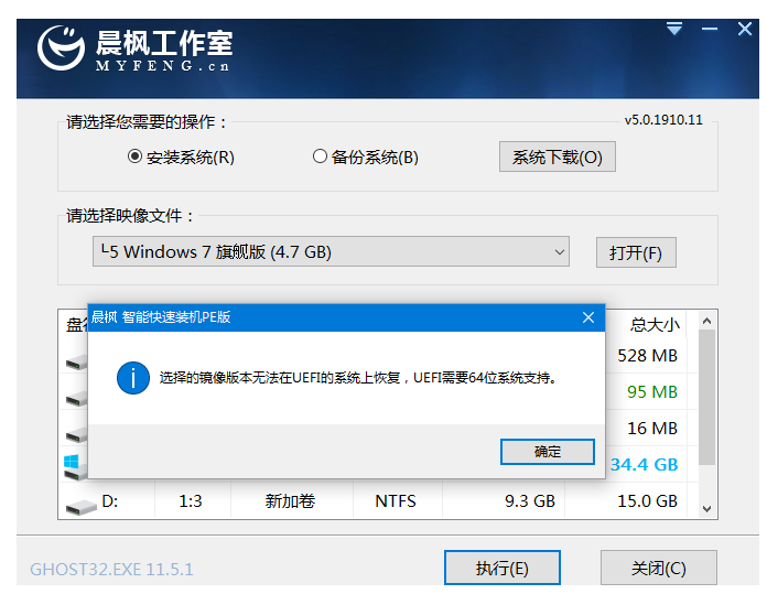 注意:在選擇win7 的鏡像系統時要注意,win7 X86是不支持UEFI啟動的。軟件會彈出如下圖彈窗,提示我們要選擇win7 X64系統。