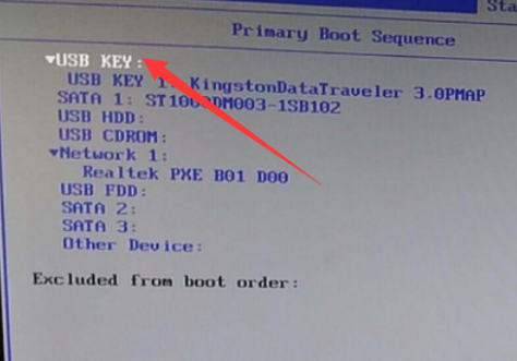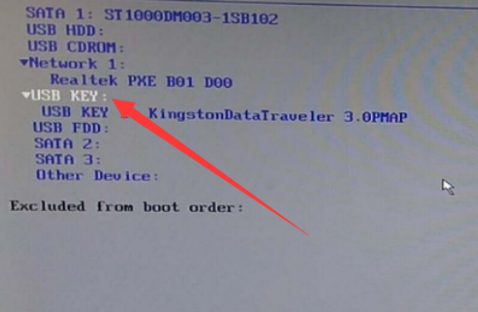 4、利用鍵盤的方向鍵將usb key移動到最上面,設置為u盤啟動,按下F10保存即可。