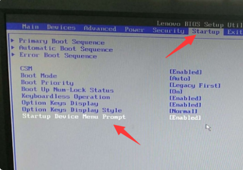 2、進入界面后,切換到Startup選項卡下,然后選擇進入startup device menu prompt。