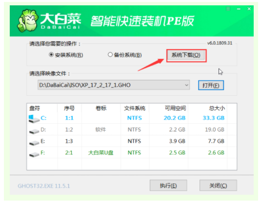 3、雙擊運行大白菜一鍵重裝。若沒有下載系統鏡像,選擇在線系統下載。如果你在重裝前準備好了系統鏡像,則勾選“安裝系統”,選擇準備好的系統鏡像和安裝路徑安裝在系統盤中,然后點擊“執行”即可。