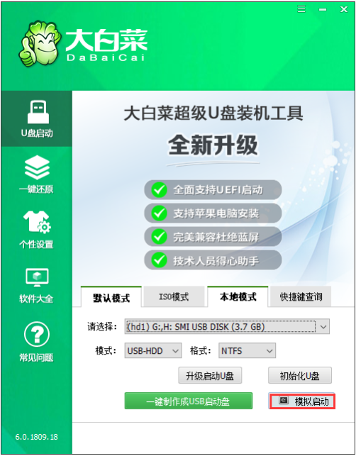1、下載安裝并打開大白菜超級U盤裝機工具,點擊做出U盤啟動,在點擊默認模式選項,注意紅框內的選擇如圖一致。