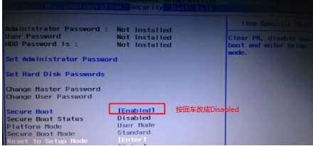 1、重啟電腦按F2或(FN+F2)進入BIOS,利用方向鍵切換【Security】選項卡下,選擇【Secure Boot】按回車鍵修改成【Disabled】。