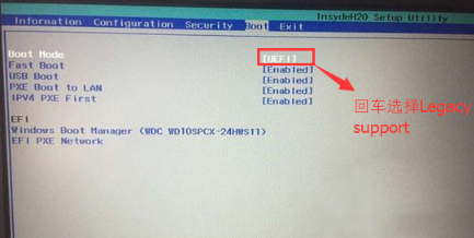 3、接著切換到【Boot】選項下,將【Boot Mode】改成【Legacy Support】。
