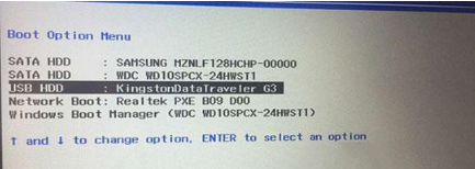 6、最后我們插入啟動盤到電腦上,重啟電腦按F12或FN+F12調出啟動管理窗口,選擇USB HDD按回車進入PE即可使用u盤重裝系統。