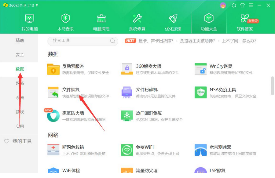 然后點擊“數據”,選擇其中的“文件恢復”。