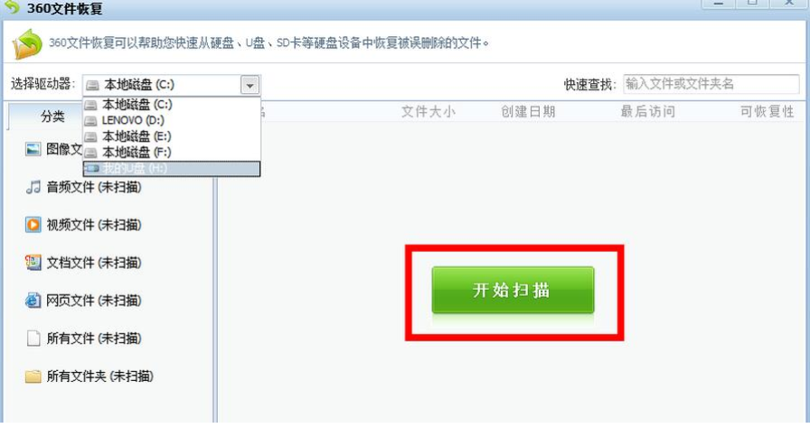 接著選擇需要恢復的u盤,選好點擊開始掃描。