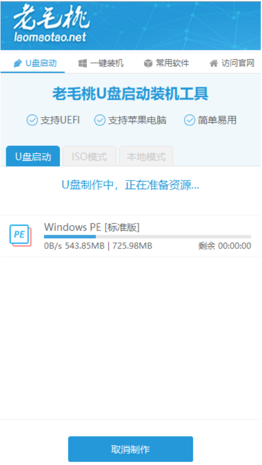 這時候老毛桃U盤啟動裝機工具對U盤寫入老毛桃相關數據,請耐心等待