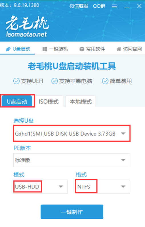 在頁面中選擇“U盤啟動”,在磁盤列表中選擇需要制作啟動的設備,在模式選項中選擇“USB-HDD”, 選擇格式”NTFS“并點擊“一鍵制作”。