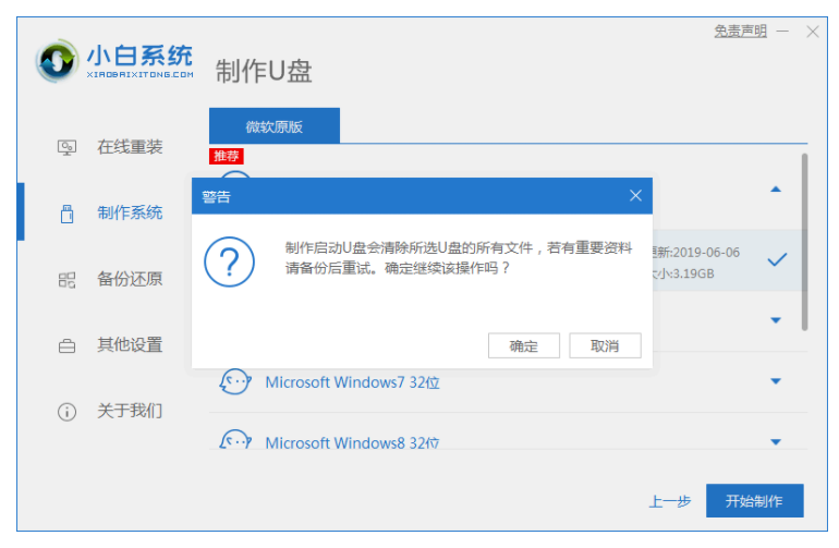 1、下載并運行小白一鍵重裝系統 ,插入U盤,選擇制作U盤,點擊開始制作。