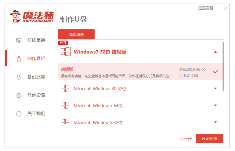 1、下載并運行魔法豬一鍵重裝系統,插入U盤,選擇u盤重裝系統點擊開始制作。