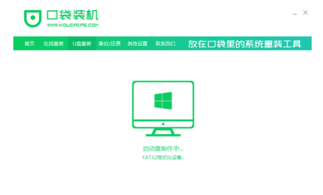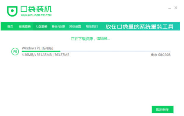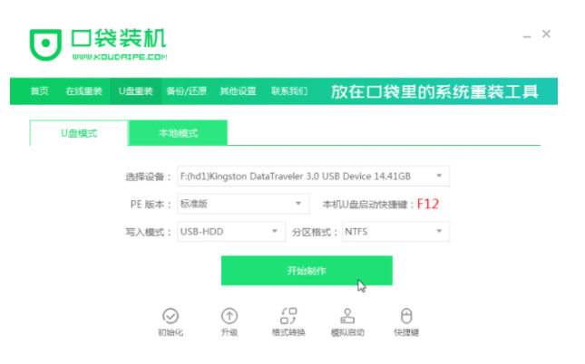 1、下載并運行口袋裝機軟件,進入頁面后選擇U盤重裝系統。