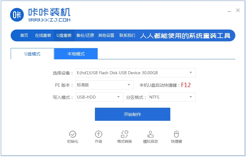 1、先在可用的電腦上下載安裝咔咔一鍵重裝系統工具打開,插入空白u盤,開始制作u盤啟動盤。