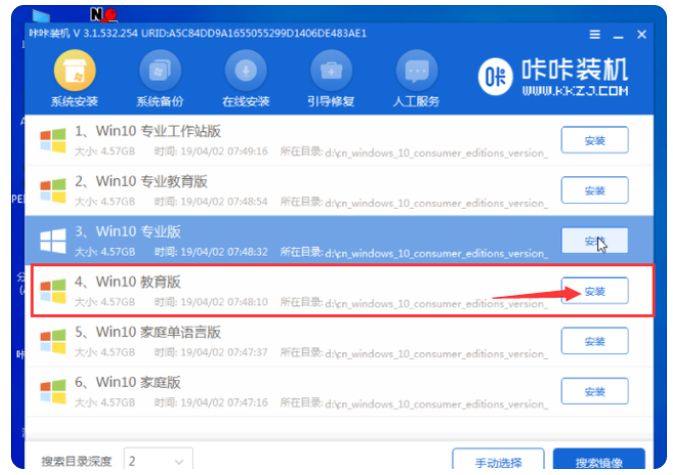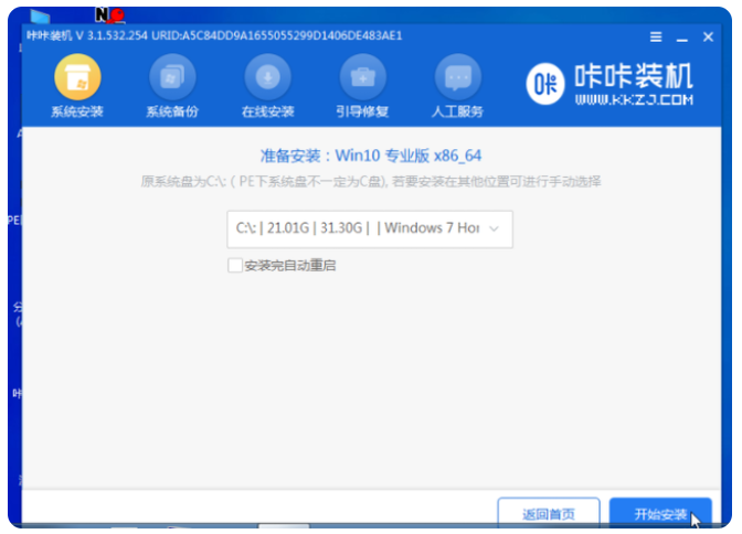 5、進入pe系統后,打開咔咔裝機工具,選擇win10系統,點擊安裝。