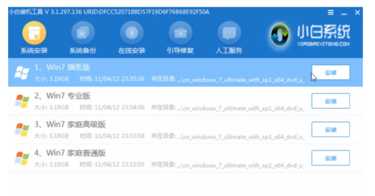 4、進入pe后打開小白裝機,點擊要重裝的系統安裝。
