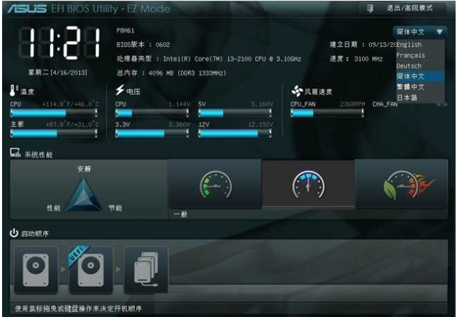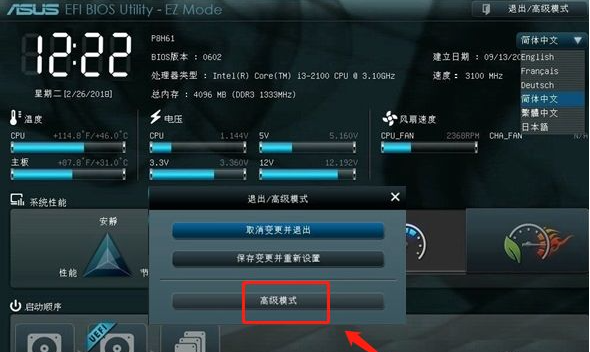 參照方法一插入啟動盤進入bios后,選擇高級模式點擊進入;