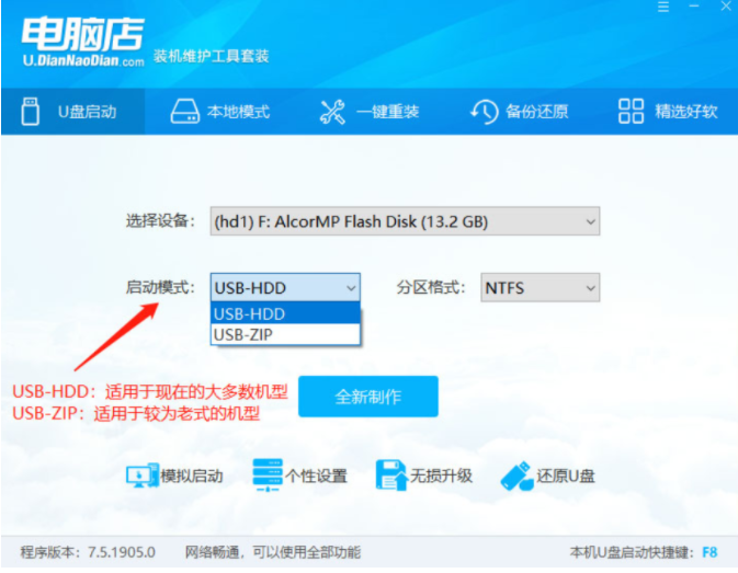 4. 一般建議保持默認,即USB—HDD模式以及NTFS格式,最后選擇“全新制作”。