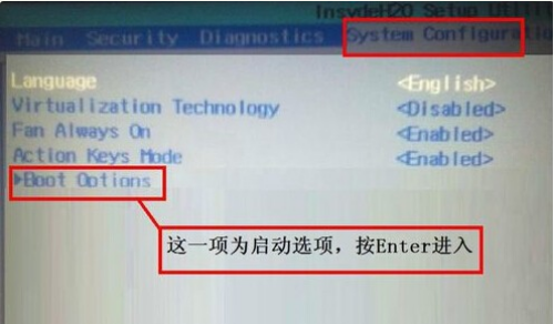 3、進入BIOS主界面后,選擇System Configuration“系統配置”,如果是英語不太好的朋友,可以先選擇Language(語言)這項,按Enter進入。