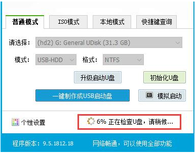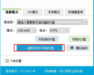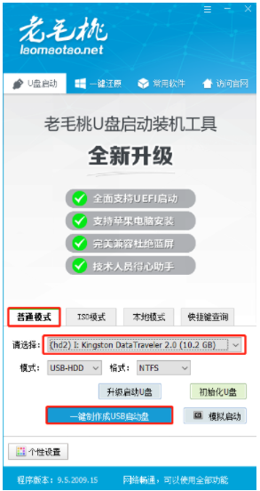 2、點擊普通模式,選擇需要制作的u盤設備,按照圖中所示選擇好。