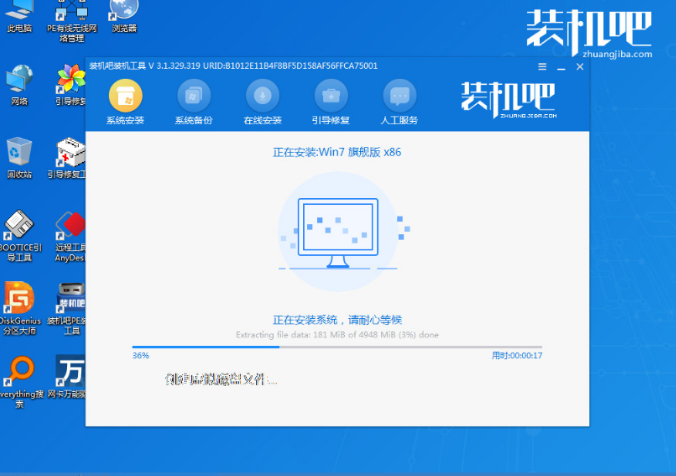 步驟五:電腦在pe系統桌面上打開裝機吧裝機工具,選擇win7系統單擊安裝到系統盤c盤,單擊開始安裝。