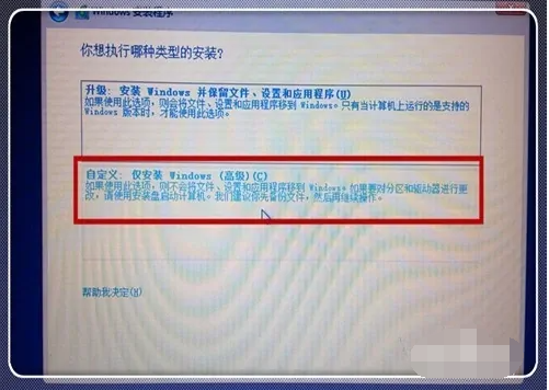 5、選擇“自定義:僅安裝Windows高級)(C)”選項回車鍵確定。一般默認是選擇安裝到系統盤C盤,點擊“下一步”,耐心等待安裝即可。