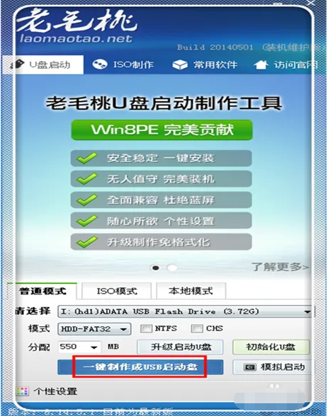 1、將準備好的空白U盤插入電腦上,打開老毛桃U盤啟動盤制作工具,點擊“一鍵制作成USB啟動盤”。