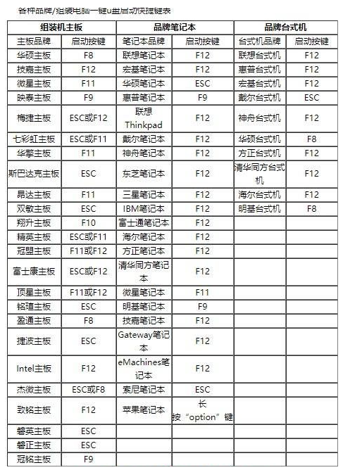 3、下圖是各種品牌/組裝電腦一鍵u盤啟動快捷鍵表,根據自己的電腦品牌選擇對應的快捷鍵。