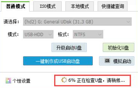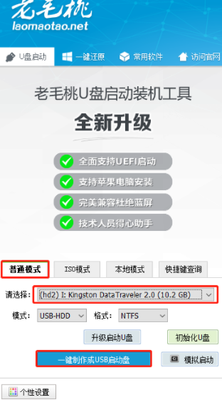 3、選擇普通模式選項卡,選擇自身U盤設備名稱(一般會自動識別)。模式選擇:USB—HDD,格式選擇:NTFS。