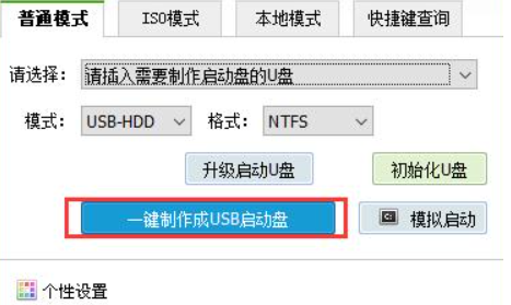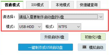 2、插入U盤,選擇普通模式,模式選擇:USB—HDD,格式選擇:NTFS。