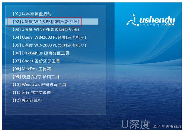 2、然后將電腦模式更改成ahci模式(不然安裝完成win7系統會出現藍屏),然后將制作好的u盤啟動盤插到電腦中,隨后啟動電腦,出現開機畫面時按下啟動快捷鍵,進入u深度主菜單后,選擇【02】u深度Win8PE標準版(新機器),會