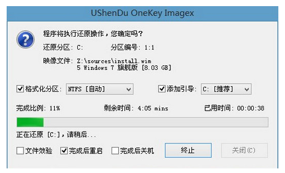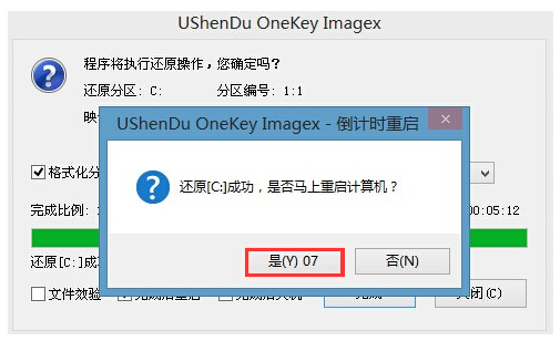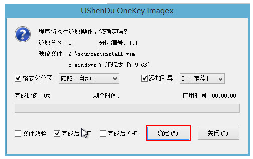 5、接著工具會將原版win7系統鏡像包釋放到所選擇的分區當中,釋放完成后出現的提示重啟窗口,點擊確定。