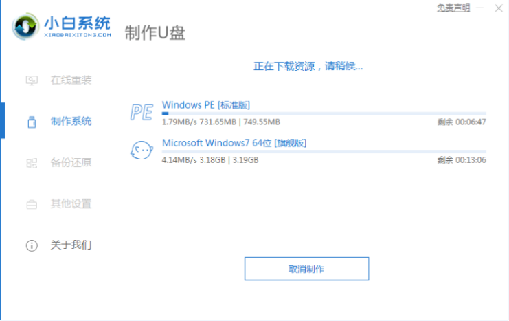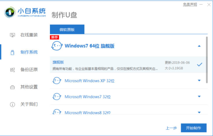 1.首先準備好一個8g左右的U盤,插入到電腦。打開軟件點擊制作系統,再單擊開始制作。