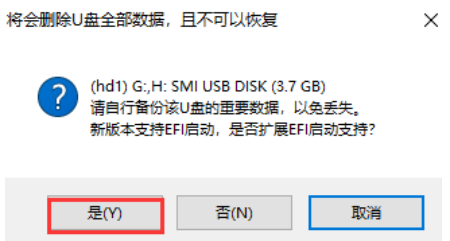 3、按下一鍵制作,彈出關于“U盤數據刪除且無法恢復”的窗口,選擇【是】。