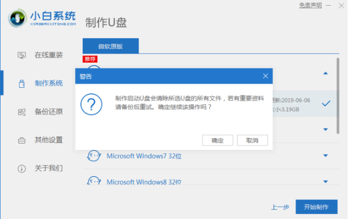 1、下載小白一鍵重裝系統軟件并打開,選擇制作系統,點擊開始制作。