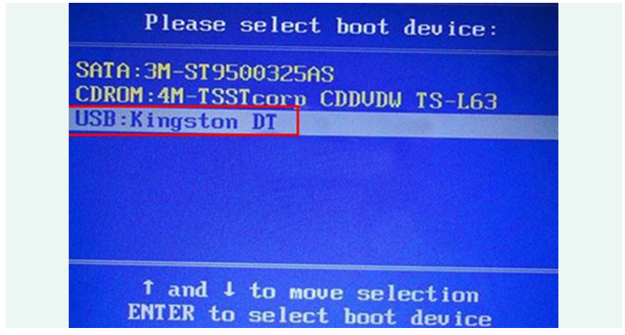 2、隨后選擇U盤選項,回車進入下一步,注意:通常帶有“USB”字樣的選項即為U盤選項。